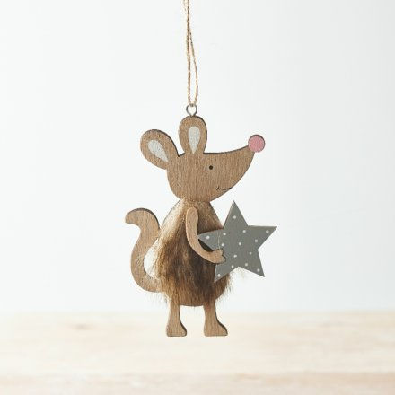 Rustic Wooden Mouse Christmas Decoration - Tree Decoration, Hanging Rat